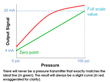 The ideal response of a pressure transmitter is graphed as a straight line from the zero point (at 0 psi) to the full-scale value, or the upper range, of a pressure transmitter. This can be referred to as the ideal line (the green line in Fig. 1). In reality, no pressure transmitter exactly matches this line; the actual response is plotted as a slightly curved line, referred to as the characteristic curve.