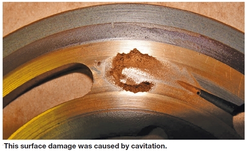 If this damage had been caused by cavitation or fluid contamination instead, the brass material would be attacked at the surface and exposed to pressure or contamination instead of the underlying iron.