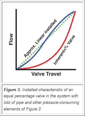 Most control systems give the best performance when they behave in a linear manner. In light of this fact, the question might be asked, "Why would you use an equal percentage valve which is not at all linear?" The answer is because of the installed characteristic. The installed characteristic is the relationship between valve position and flows in the specific system being considered, taking into account any changes in the pressure differential available to the control valve due to the flow-squared relationship between flow and piping pressure losses and/or the behavior of a centrifugal pump's head curve.