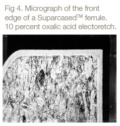 A micrograph of a polished and etched cross section of the front edge of a Suaprcased™ ferrule is shown in Figure 4.