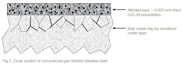 The disadvantage of the conventional gas nitriding process (as well as conventional carburization and carbonitriding processes) is that it substantially reduces the corrosion resistance of stainless steel. The nitrided layer was generally so tightly "buried" into the surface of the tubing during fitting make up that it was not exposed to the corrosive effects of the chemicals contained by the system, but anything on the outside of the fitting, such as seawater, could penetrate from the back of the ferrule and attack the nitrided area.