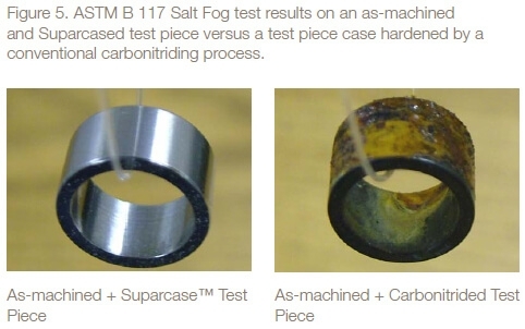 Examples of the results of the Salt Fog test are shown in Figure 5. The test pieces case hardened by the Suparcase™ process were unaffected by the salt fog exposure, whereas the test pieces case hardened by a conventional carbonitriding process exhibited significant red rust corrosion.