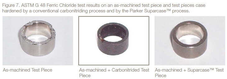 There was no evidence of corrosion of the Suparcase™ case hardened ferrule. Examples of the results of the Ferric Chloride pitting corrosion test are shown in Figure 7. The as-machined test pieces and the test pieces case hardened by a conventional carbonitriding process all had significant weight losses in this test, whereas the test pieces case hardened by the Parker Suparcase™ process did not have measurable weight losses.