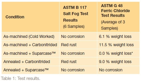 Samples of these test pieces were case hardened by the Parker Suparcase™ process or by a conventional carbonitriding process in both the as-machined and following vacuum annealing at 1900° F conditions. The case hardened test pieces and the as-machined test pieces were corrosion tested using the ASTM11734 Salt Fog test procedure for 96 hours or the ASTM G 48 Ferric Chloride pitting test procedure for 72 hours.